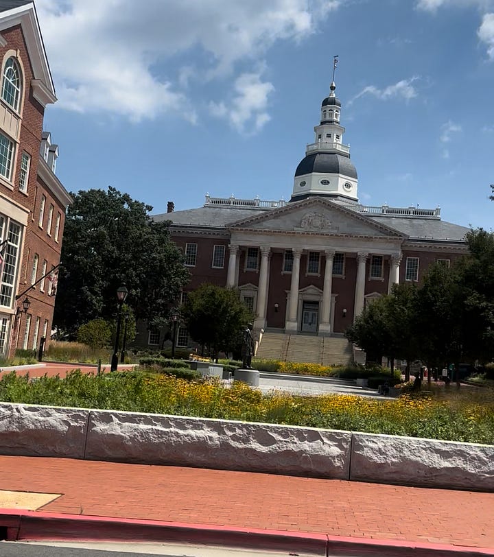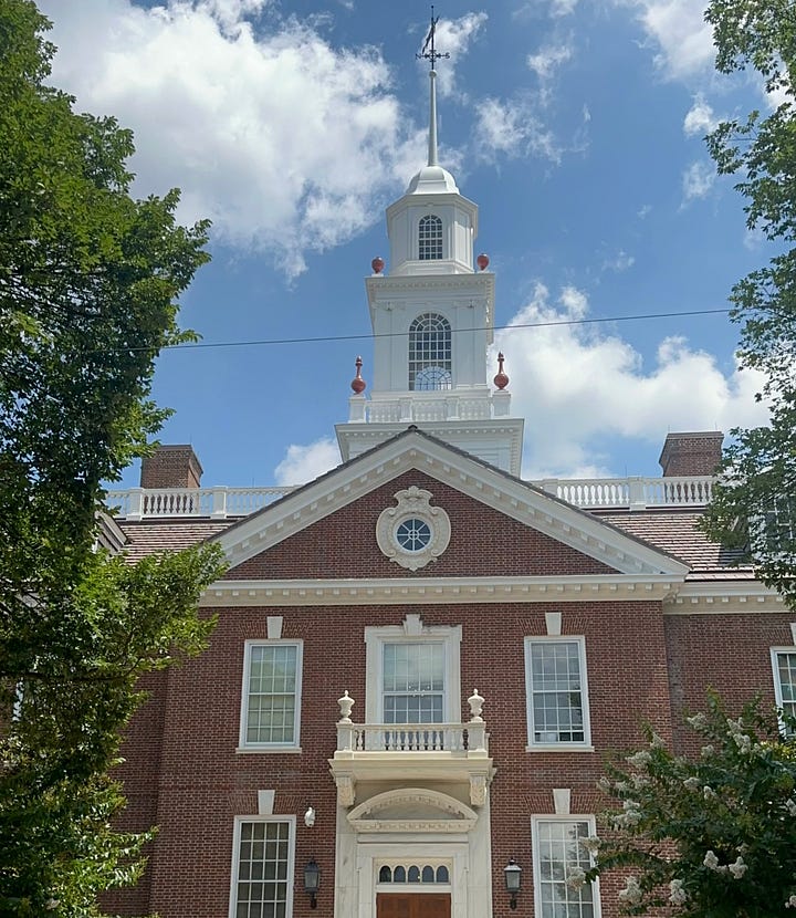 Our week started with an unexpected change of plans. The internet at our campsite in Delaware wasn’t just slow, it was nonexistent. Zac woke me up early, frustrated that he couldn’t connect for work. We tried everything: starlink, driving into town, even setting up at the local library. Nothing worked. In the end, reliable internet took priority over sightseeing, so we booked a site in Pennsylvania and packed up, hoping the next place would at least give us a clear view of the sky. Before leaving Delaware completely, we made a quick stop at the capitol building in Dover for a photo.