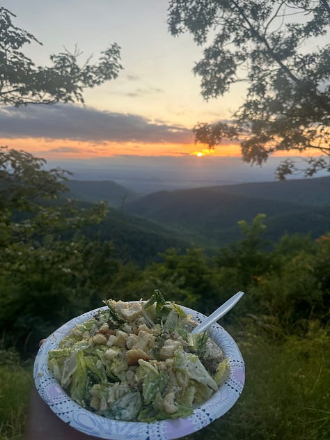 Later in the afternoon, we took a short hike at Blackrock Summit, just over a mile with a slight incline. It was an easy trail after a week of minimal exercise, but the reward was huge, a sweeping view of the mountains that was selfie-worthy. Continuing on Skyline Drive, we ended the day at an overlook, watching the sun set as we ate Caesar salads topped with leftover grilled chicken. This was the kind of day that made us forget the week’s frustrations, and reminded us how lucky we are to be able to wing-it for a day. After dinner, we drove out of the park and found a Cracker Barrel to stay at for the night.