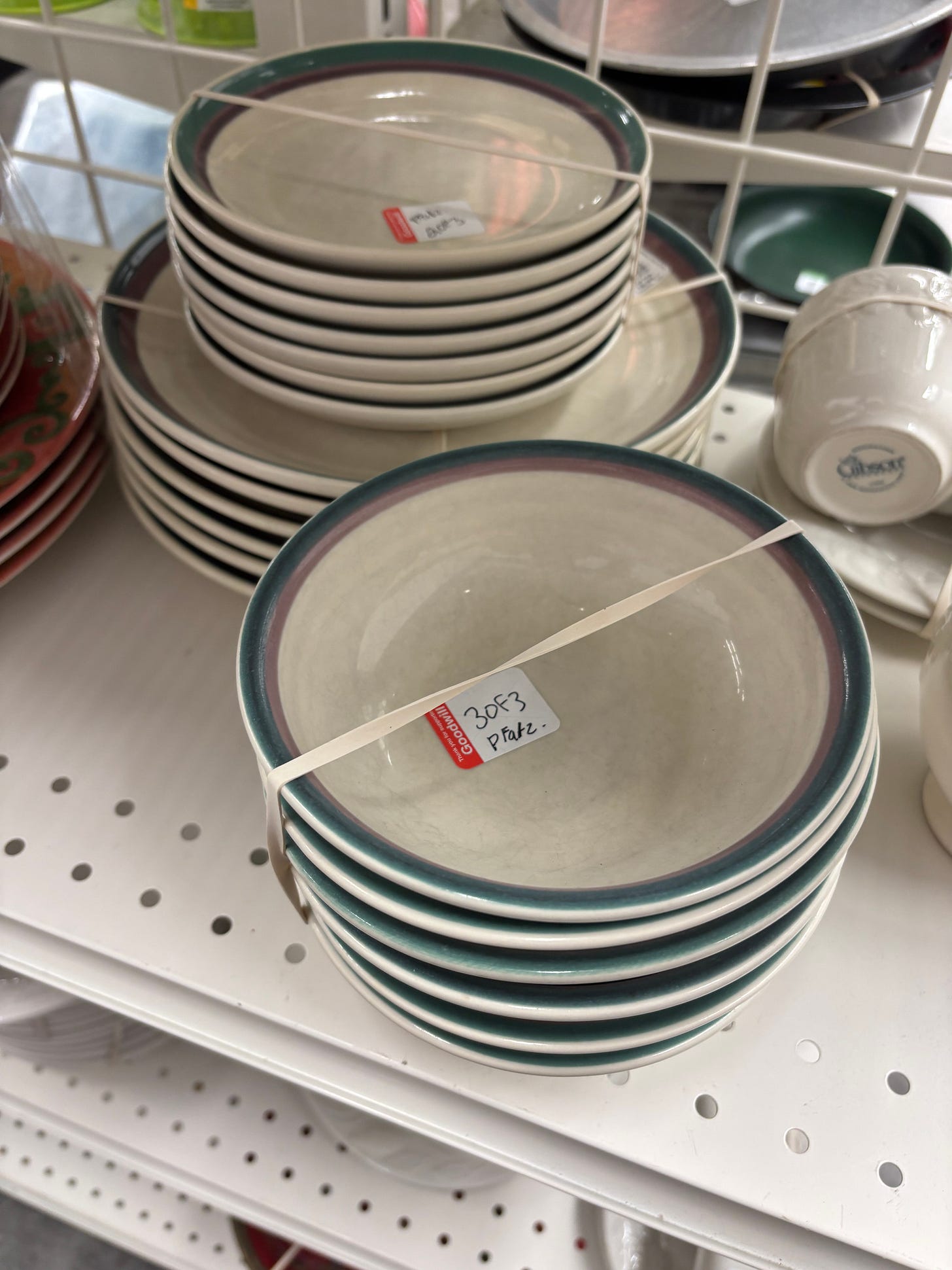 It’s been a few months since we’ve been to the movies so we went tonight for a discount showing. On the way to the theater, we spotted a Goodwill and decided to pop in. We weren’t looking for anything in particular, just killing time before the movie. While browsing, I spotted a set of dinnerware that instantly caught my eye (the exact kind I’d grown up with). I couldn’t help but point it out to Zac, snap a picture, and send it to my family.
